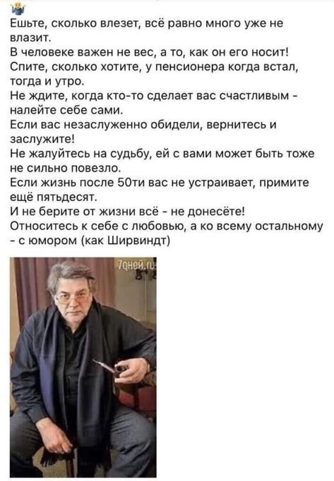 6. О членстве в компартии Политикой Ширвиндт не интересовался, что сберегло ему немало нервных клеток, и членом партии не был. На тему членства у народного артиста был припасен шутливый афоризм, который он почерпнул у Иосипа Броз Тито, бывшего президента Социалистической Федеративной Республики Югославия: «Когда Тито спрашивали, как это Югославия вроде бы в социалистическом лагере, а вроде бы и нет, он отвечал: "Югославия — это как яйца при половом акте. Они участвуют, но не входят". Это про меня».