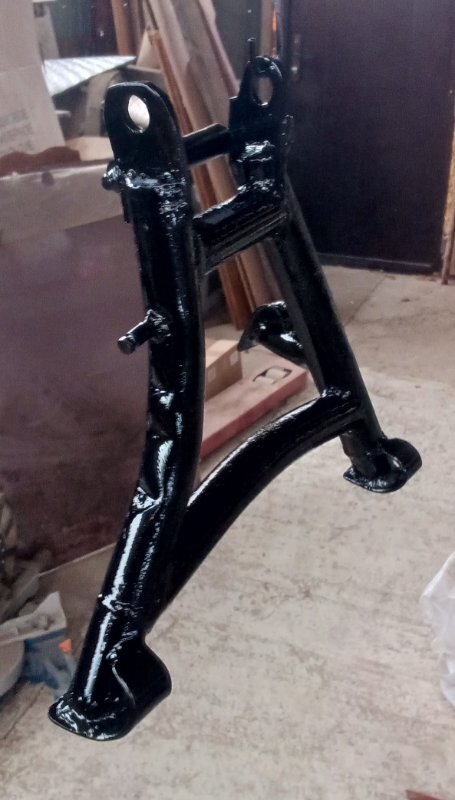 Я тоже замутил себе центральную подножку. Подумал что проще самому. От альфы надо гдето купить, потом укорачивать, потом усиливать. Решил проще самому сварить. Правда провозился весь день. Висит сохнет покрашеная. Это вчера. Сегодня уже поставил. Работает нормально. Кстати штырёк для крепления пружинки есть. Он справа и выше отверствия для крепления подножки на пару сантиметров. Пружину поствавил от жигулей класики с тормозных колодок. За одно и задний подкат сделал.