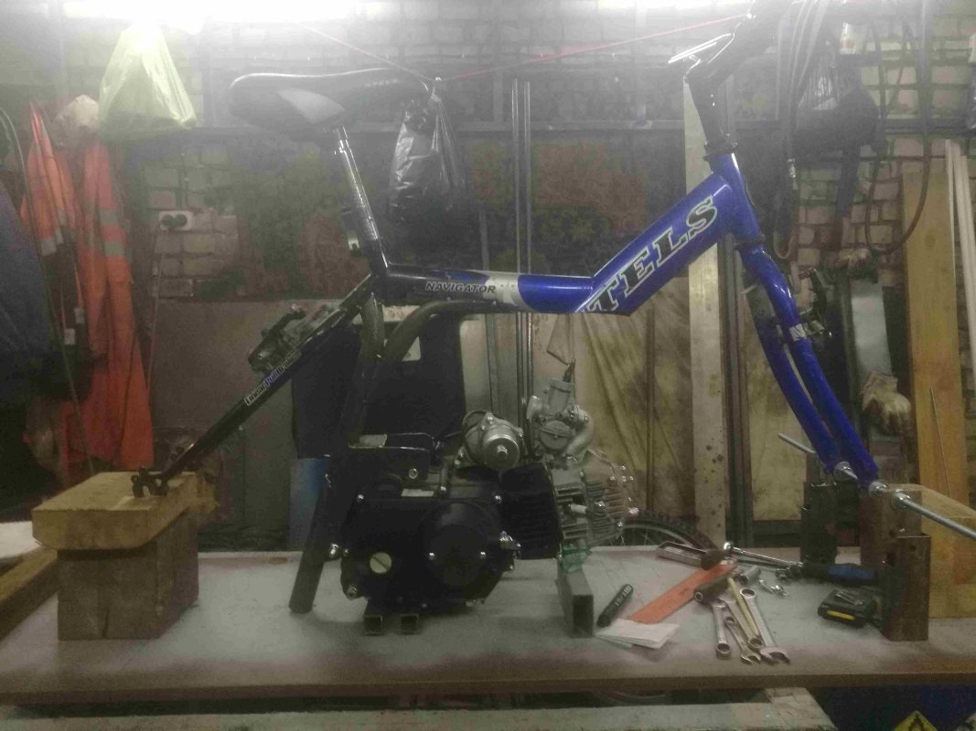 хочу поделиться самоделкой. мотор использован 152 FMH. начал собирать 1 февраля 2025 , первый выезд случился 19 апреля. рама сначала была велосипедная Стелс, но позже стала почти полностью их труб