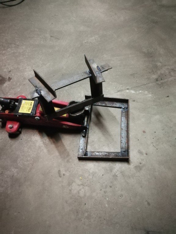 Решил сегодня немного поковырять мот. Побрел в гараж, чет потыкался и понял, что без подставки хреново. Хорошо, что в гараже валялся уголок и домкрат подкатной, правда немного сломанный. Короче сварка и болгарка творят чудеса Никакой эстетики мне не надо, поэтому было сварено достаточно быстро. Поднимает хорошо, устойчиво. Мот можно крутить на стойке на 360 градусов, но из-за этого всегда есть наклон, так как пятак домкрата имеет приличный люфт. В принципе, два тычка сваркой и все будет прямо, но тогда никакого вращения. Ну и перевес получился на заднее колесо, но очень небольшой. Если заднее снять, то мот перевесится вперед. Окультуривать не стал, так как думаю еще немного доработаю конструкцию. Руль еще нужно купить, что наиболее приближенное есть, только покрепче немного? Руль CRAZY IRON кто-то ставил?