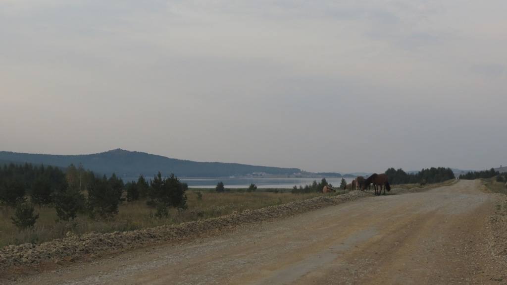 Вечереет, и я приближаюсь к берегу небольшого Ямашлинского водохранилища, где планировал встать на стоянку. Увы, берег слишком благороден для такого одичалого гостя, как я: все проходимые подходы перекрыты базами отдыха и прочими гостевыми домами. Конечно, совсем не составляет проблемы, чтобы пройти через одну из баз и взойти на ближайшую Ямашлинскую гору. Гора невысока, около 400 метров, но крутой подъём сильно выматывает. К тому же путь на вершину преграждает небольшое, но агрессивное инопланетное существо, которое яростно атакует камеру фотоаппарата. После изнурительного подъема взгляду открывается замечательный вид на ближайшие лесистые вершины и на дорогу вдоль Ямашлинского водохранилища. Спускаюсь с горы, а потом пару километров еду вдоль берега ручья Аккундуз и, наконец, нахожу отличную поляну для палатки. На всякий случай, готовлю укрытие от капризов природы и вовремя. Полянку и склоны близлежащих холмов накрывает коротким и не очень сильным дождём. Но всё это совсем не важно, когда есть надежный мотоцикл, крыша от дождя, вкусная после долгого дня еда и освежающий ручей, в котором можно искупаться перед сном.