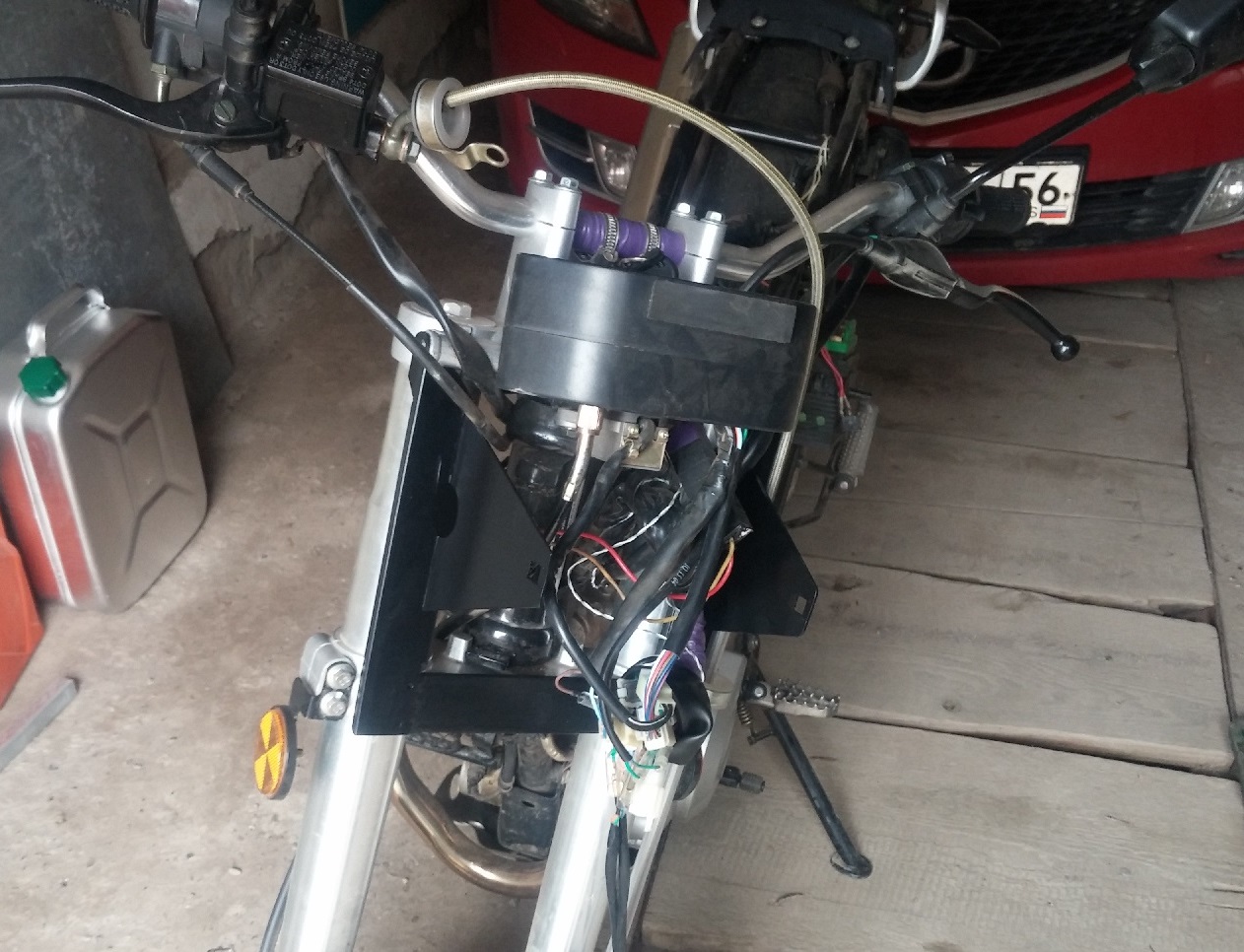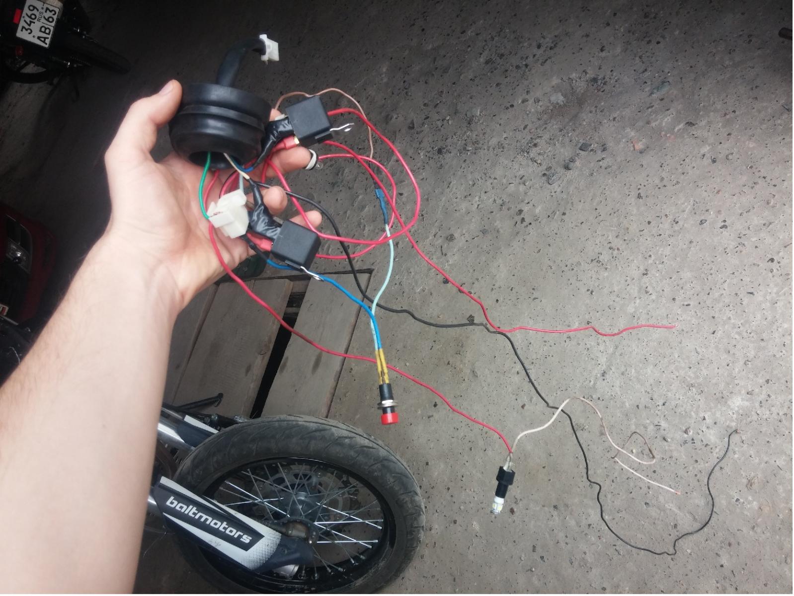 Все мотоциклисты ругают головной свет своих мотоциклов. кто-то больше, кто-то меньше. Владельцы БМ, как я считаю, относятся к первому лагерю, ибо свет фары моего мотарда был схож со светом керосиновой лампы в руках карлика, бегущего перед мотоциклом. Существует довольно много разных вариантов исправления сей ситуации на любой кошелек и вкус: Светодиоды, их я люблю и хотел больше всего, но... 1)Сетодиодные лампочки дороги, у них проблемы со световым пучком и охлаждением. 2)Светодиодные фонари неплохи, но дают только дальний свет 3)Готовая светодиодная фара с ближним и дальним светом, стабилизатором, охлаждением и прочими плюшками стоит как героин Ксенон 1) ксенон в родной фаре сулит яркий свет и проклятия всех остальных водителей 2) ксенон в линзе внутри родной фары интереснее, но все равно на кочках бы выжигал сетчатку всех встречных, а это опять проклятия всех и вся 3) ксенон в линзе с автокорректором, омывателем стоил бы как еще один мотоцикл 4) ДПС была бы против ксенона всегда и везде. Галогенки 1) более мощная или с повышенной отдачей галогенка в родной фаре – чуть лучше, но световой поток не идеален, хотя и максимально недорого 2) более мощная галогенка с новым оптическим элементом и корпусом – компромисс денег и качества – это мой выбор! Был изучен вопрос в интеренете и разработан план: 1) покупка отптического элемента wesem PES4 489.50 H4 2) покупка лампочки Н4 55/60 Ватт - выбрал Филипс Xtreme moto 3) покупка корпуса фары от Ижа или Урала 4) колхозинг паука круглой фары из подручным материалов 5) подключение через релюхи 6) ничего не испортить (забегая вперед скажу, что 6 пункт выполнен был не полностью….). Покупка и заказ прошли просто – бабки перевел и жди А вот с креплением веселее, я хотел потратить поменьше денег, так что материалом стали профильные трубы 20*40 мм и старый диска от циркулярной пилы. Крепить я решил к местам, где уже есть дырки и болты, а именно - крепление крыла и крепления верхней части вилки (где поворотники еще). Пришлось повозиться с вырезанием деталей и подгонкой по месту, Также было непросто просверлить дырки в старом диске циркулярки, ибо металл там хороший, в итоге дырки я випилил болгаркой, а перешеек потом приварил обратно. (дырки получились квадратными). Потом зачистка, грунтовка и покраска, тут на помощь пришли соседи, занимающиеся кузовщиной. К сожалению мало фоткал процесс вырезания/сварки, только готовый результат. Тут я накосячил – надо было внизу варить встык, а не внахлест, но эта идея пришла мне в конце после покраски и я забил, Получилось крепко и надежно примеряем Дальше подключение я решил минимально вмешиваться в штатную проводку и провел новую рядом от аккумулятора. Прикупил мелочевки Схема такая (нашел в интернете похожую) предохранитель на 7,5 поставил (можно два по 5, если будете вести разные провода на ближний и дальний). управляющее питание на релюхи с пульта (взял с родного штекера лампы). также я хотел иметь возможность оставлять только габарит без головного света (например на время заводки и прогрева) для этого я внедрил кнопку на минусовый провод. Выбрал такой вариант, ибо не смог найти влагозащитную кнопку и использовал обучную, соответственно не хотел бояться, что ее замкнет на массу, а так максимум что будет – включиться свет). В процессе выяснилось, что изначально на моте не работал габарит, чего я не замеча