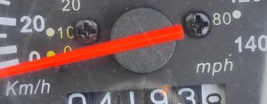 Там по-моему две шкалы, одна белая другая жёлтая (км/ч и миль/ч) Дак вот желтая которая в милях, представь что она в км и ориентируйся по ней. В км/ч - белую шкалу вообще не смотри. Мот какого года если не секрет?