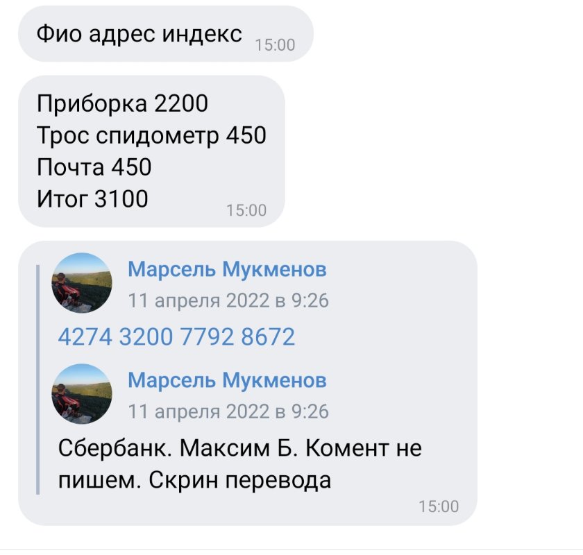 Кирилл, добрый день. Увидел, что вы заказывали запчасти у Марселя. Я тоже заказывал год назад. Тогда переводил деньги на карту, которая на него и зарегистрирована. Общался снова вчера с ним в ВК, он карту написал не свою ... У меня сомнения... Нет ли обмана. Может страничка не его, или ещё что-нибудь. Вы не заказывали не так давно давно у него запчасти?