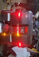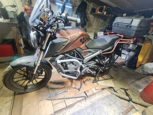 Была сварена клетка и багажник под кофры, установлено лобовое стекло(ещё летом, иначе на 80ти км.ч меня сдувало))), поставил заднее крыло (чтоб не закидывало грязью), заменена передняя звезда с 13 на 15(на 100км/ч сильно ревёт, не комфортно. Поэтому я сдвинул диапазон оборотов). Крышку подрезал, иначе не входит.