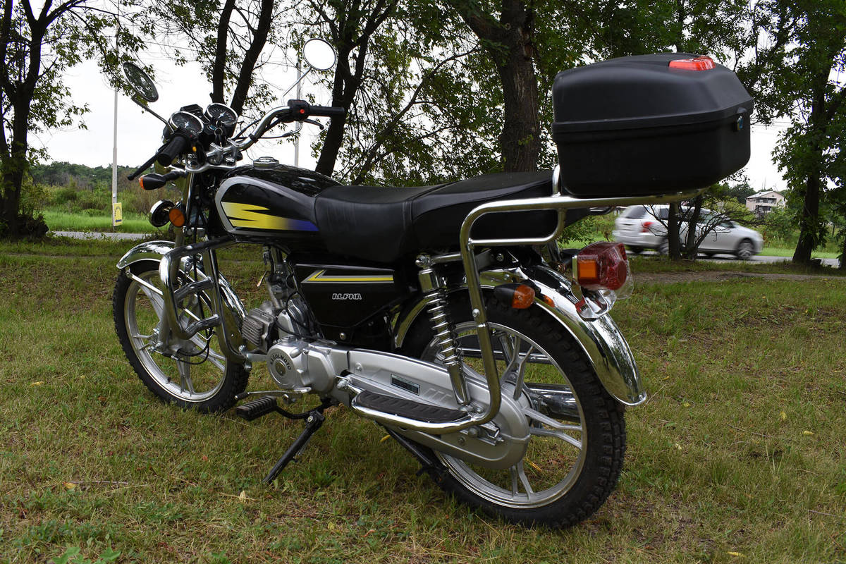 Regulmoto Alpha 110 Характеристики: - Объем двигателя: 110 см3 - Тип двигателя: одноцилиндровый 4-х такт - Мощность : 7,1 л.с - Балансировочный вал: отсутствует - ГРМ: цепь - Габариты, мм: 1920х770х1080 - Система охлаждения: воздушная - Макс. скорость: 90 км/ч - Расход топлива: 2,2 л - Размер топл. бака: 6 л - Зажигание: CDI - Главный привод: цепь 428Н - Система запуска: электро/кикстартер - Передние тормоза: барабанные - Задние тормоза: барабанные - Пер. подвеска: телескоп - Задняя подвеска: 2 моноамортизатора - Переднее колесо: 2.50-17 - Заднее колесо: 2.75-17 - Вес: 82 кг - Макс. нагрузка:150 кг