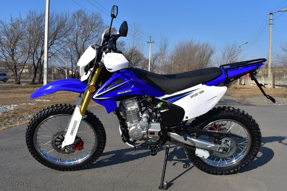 Всем привет! Вроде как первая новинка 2022 года из поднебесной. Информации уже достаточно, попробовал собрать всё вместе. Форум малоактивен, очень быстро все перебрались в другую среду, ссылка под спойлером Regulmoto TE (Tour Enduro) PR Выпускается в двух модификациях: - с КПП на 5 передач + кикстартер; - с КПП на 6 передач. Эндуро двойного назначения. - Двигатель: Zongshen PR 172FMM с балансировочным валом - Объем двигателя: 250 см3 - Мощность: 21 л.с. - Система охлаждения: воздушная - Система запуска: электро (в версии с 5 передачами + кикстартер) - Зажигание: CDI - Карбюратор: PD30-RM (вроде Keihin) вакуумный - Объем топливного бака: 10-14 л (пока нет точной инфы) - Расход топлива: 2,4-3,4 л/100км (тоже не проверено) - Размер колёс: 3.00/21 4.6/18 - Подвеска передняя: перевернутого типа (не регулируемая), перья 41 мм - Подвеска задняя: моноамортизатор с прогрессией (два положения в нижней проушине для регулировки высоты) - Цепь: 520H - Аккумулятор: 12V, 6,5Ah - Приборная панель: электронная - Вес: 131 кг - Головной свет: светодиодный, линзованный с подсветкой сегментов вокруг фары - Указатели поворота: светодиодные с бегущими дорожками - Задняя оптика: обычные лампы габариты/ стоп-сигнал и подсветки номера - Поставляется в фанерной коробке: 1560х460х860 с ПТС, имеется крепление под номерной знак Подвеска перекочевала с модели Sport-003. На просторах сети находил информацию, что будет к нему к лету в продаже ветровик, кофры и защитные дуги. И что для этого всего предусмотрены штатные места.