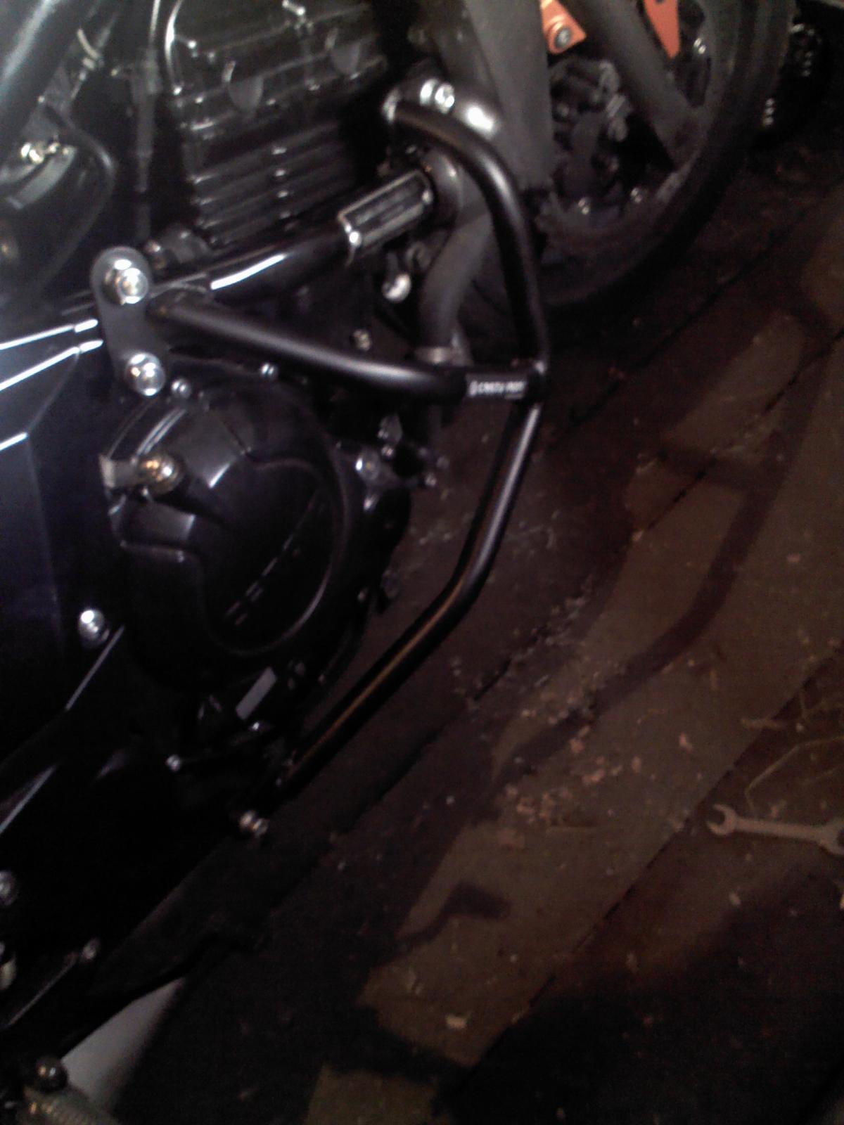 Изначально не мог понять зачем там одна фиговина, которая потом методом исключения понятных слов из списка "комплектность" была определена как шпилька. Решил - млин что-то напутали, может здря положили ... короче, думаю совсем неважная инфа для головы, забивать её не буду мысли! Так вот - приехал к коняге ииии ....  :blink:  ... забыл фотик взять с собой и фонарик, о чём вторично пожалел ... сначала о фонарике, в конце действа - о фотике. И так, распаковался беру правую дугу (мот ведь на подноге), примерил - ляпотаааа ))) начинаю прикручивать, всё понятно - один болтик рядом с подножкой откручиваю, вместо него из комплетухи с проставкой, хоп - рядом с радиатором, а в конце хомутик ближе к седлу. Ляпотаааа сморю, кайфую, расстояние м/у дугой и корпусом см 5, боялся что будет почти впритык, так на фотке смотрелось, которую видел. Устанавливаю байк аккуратно с наклоном теперь направо ... примеряяяю ииии %Ъ№Ь?Ъ*ЬЬЬ":Ъ;%%. короче, непереводимый французкий сленг. Третий нижний конец крепления весит в воздухе, если 2 других совместить!  :angry: Одним словом, после танцев с бубнами вокруг мота, я понял в чём фишка ... да, да, да ... дело в той самой шпильке, которая в комплекте и которая "в оригинале", одна с киянкой + такой-то матери оч. долго снималась, другая с теми же приспособами оч. нудно одевалась. (ах дааа - чуть не забыл сказать что первую/правую/ дугу пришлось из-за конструктивных особенностей нахождения шпильки - снять, для того чтоб установить левую)