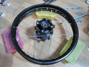 У кого как, а у меня в самом разгаре ремонт. В этот раз решил не отдыхать, а делать заранее всё намеченное к следующему сезону. Ибо потом весной просыпаешься, а нифига не успел. И вот сегодня оформилась основная моя идея по установке другого заднего колеса и тормозов. В стоке уродливо всё. эта огромная тяжелая ступица с отстойными сайлентблоками и узким ободом. Этот огромный торчащий из-под сраки на кронштейне тормозной суппорт. Лежат у меня еще позапрошлой зимой купленные обода 16*1.85, но с 32 спицами. И вот что в конце концов сегодня нарисовалось